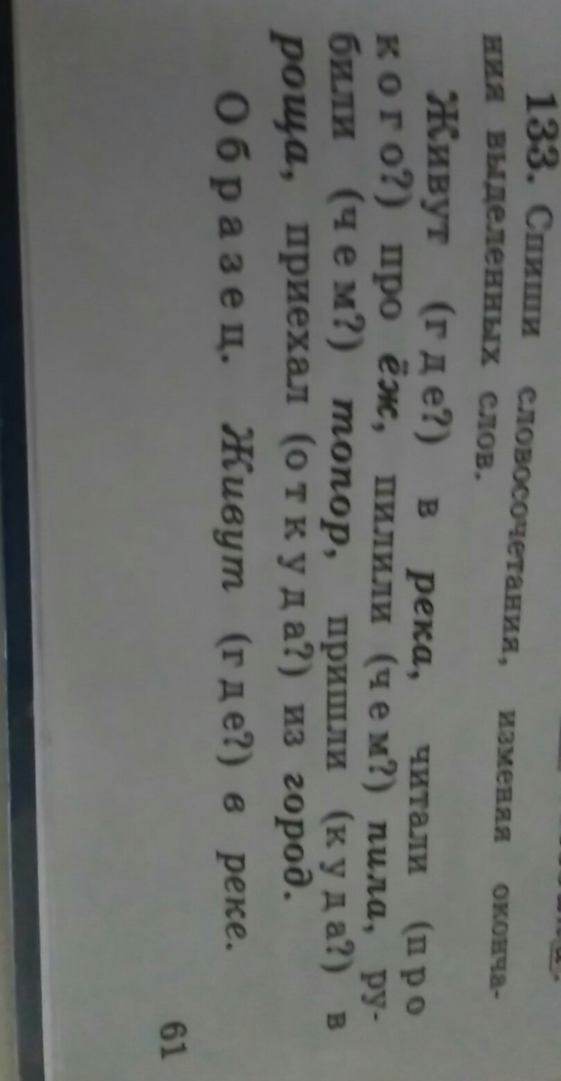 Живут (где?) в рекЕ. Читали (про кого?) про ежА. Пилила (чем?) пилОЙ. рубили (чем?) топорОМ. Пришли (куда?) в рощУ. Приехал (откуда?) из городА