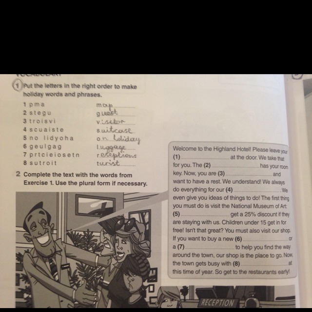 1. Luggage 2. receptionist 3. on holidays. 4. visitors. 5 guests.6.suitcaise 7.map.8.turists