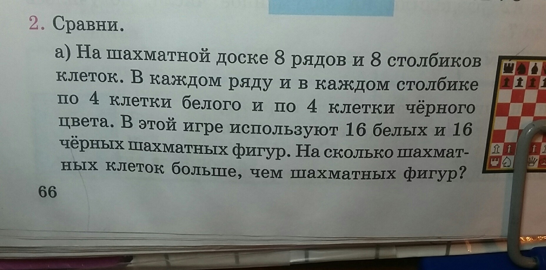 Ответ: на 32 шахматных клеток больше чем шахматных фигур