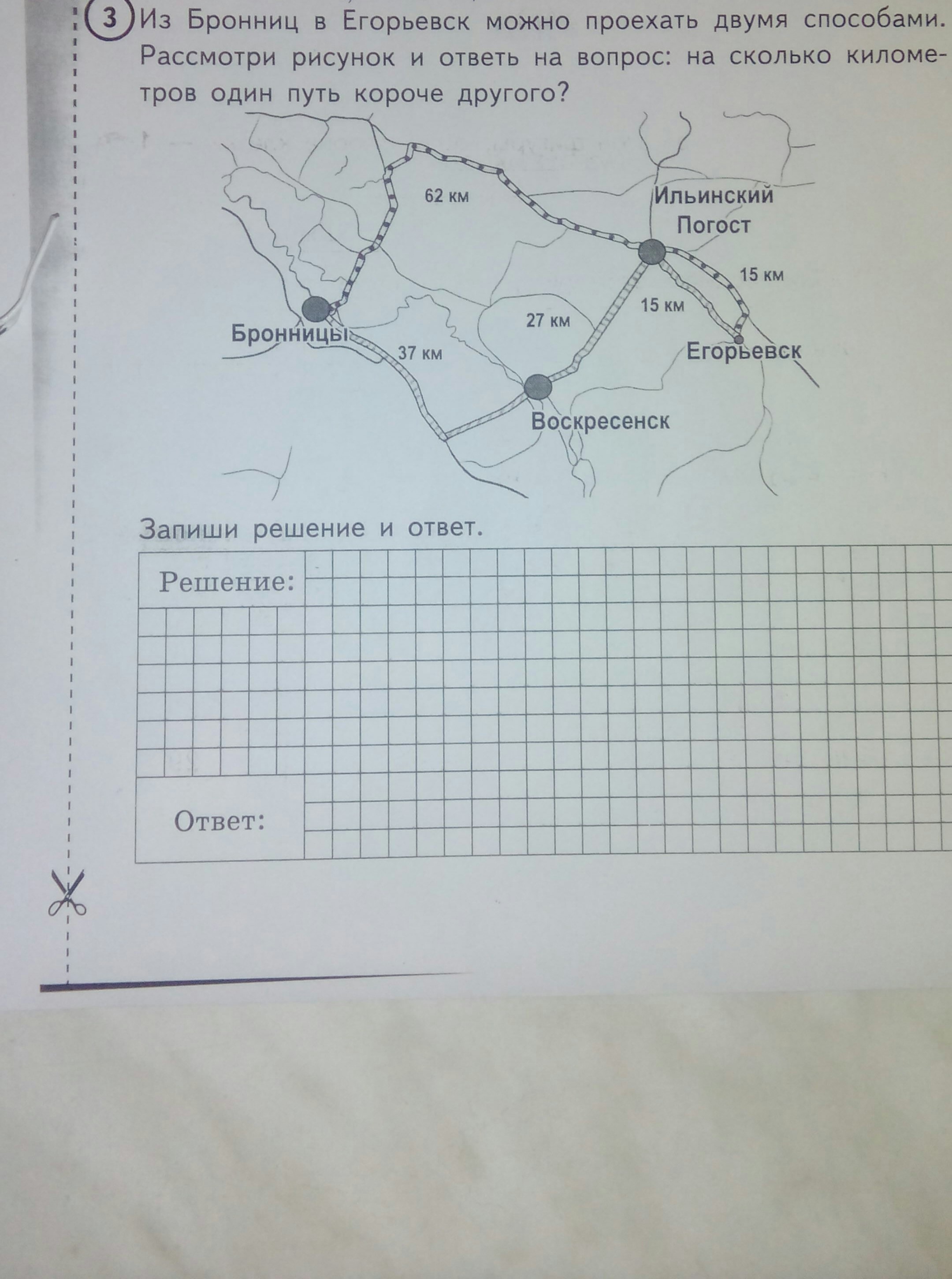 Ну ,думаю, 1 путь-это из Бронницы в Ильинский Погост ,затем в Егорьевск. 2 путь Из Бронницы в Воскресенск ,потом в Ильинский Погост ,а затем Егорьевск. 1) 62+15=77 км-1 путь 2)37+27+15=79 км-2 путь . Какой путь длиннее-1) 79-77=2 км. Ответ 1 путь короче 2 на 2 км.