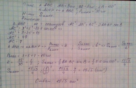 Стороны треугольника равны 3 и 5см, а угол между ними 120 градусов. Найдите площадь подобного ему треугольника с периметром 30см.