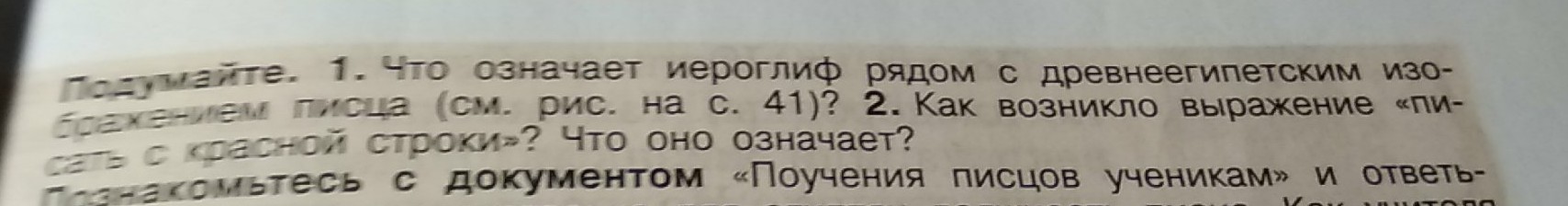 Иероглиф рядом с древнеегипетским изображением писца означает означает чернила или письма писцу.В древнем Египте не было чернил и бумаги.Поэтому экономили место.И чтобы показать начало другого абзаца,выделяли первые буквы красным цветом.Отсюда и пошло выражение ''писать с красной строки'', что означает что начинается новый абзац.