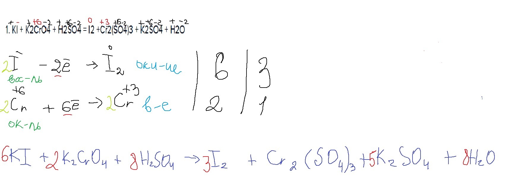 1. KI + K2CrO4 + H2SO4 = I2 +Сr2(SO4)3 + K2SO4 + H2O
