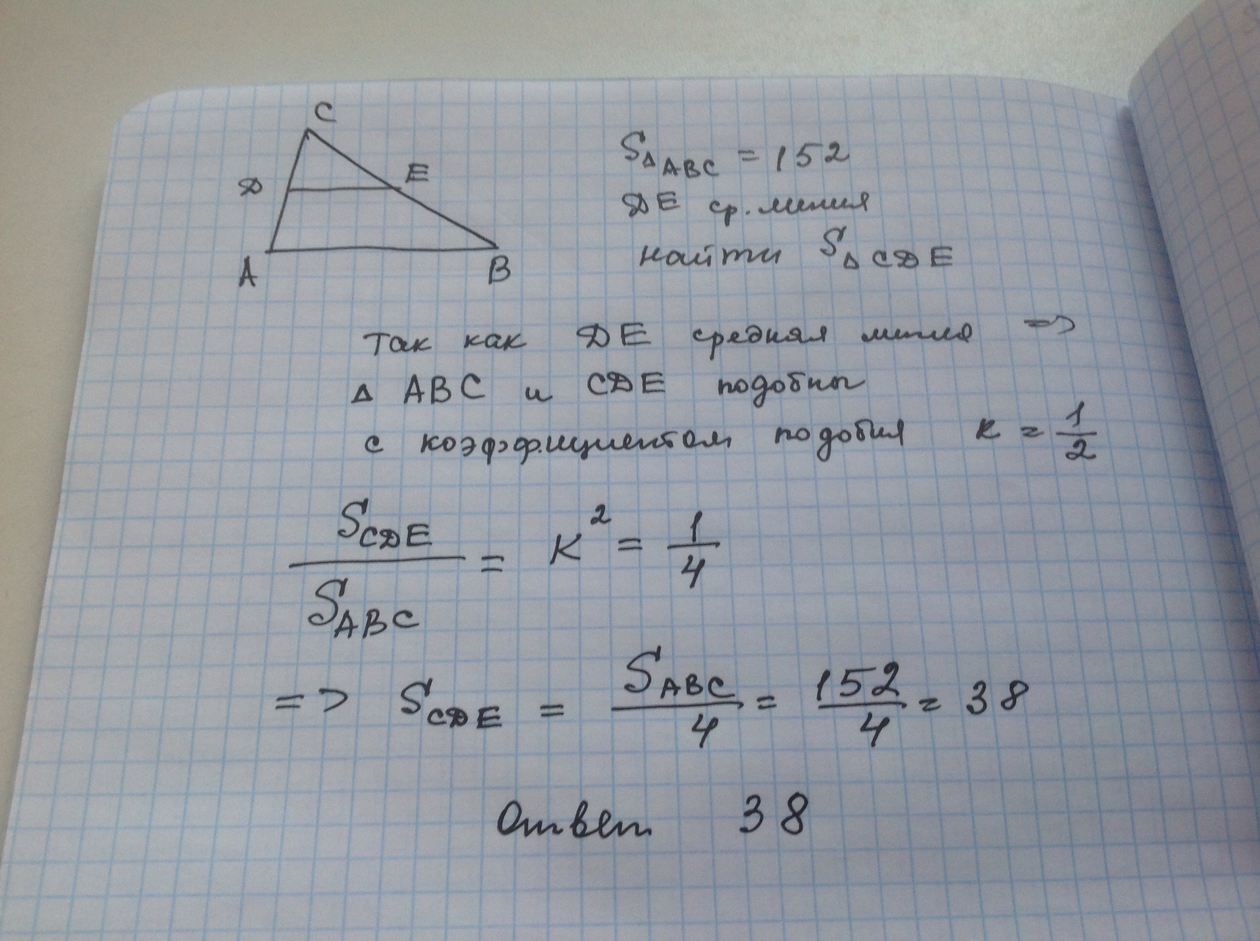 Площадь треугольника АВС равна 152. DE - средняя линия. Найдите площадь треугольника CDE.