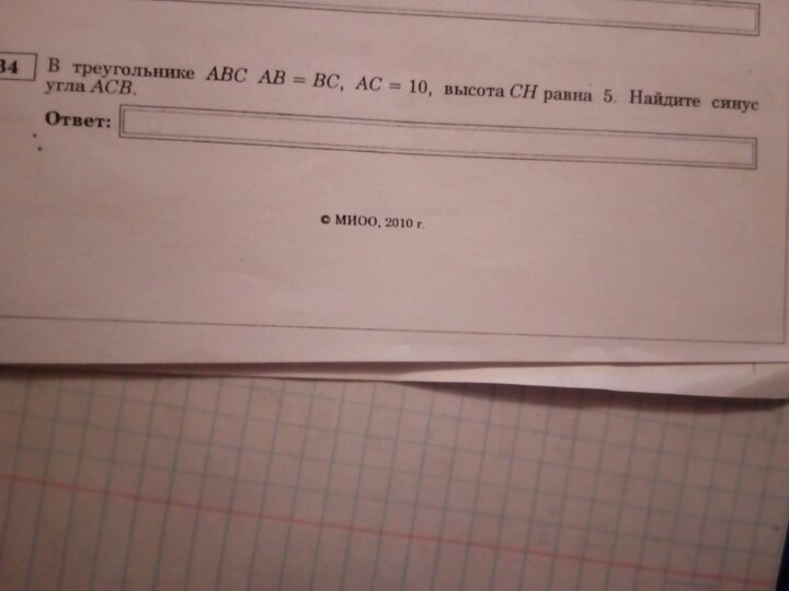 Помогите, пожалуйста! В треугольнике АВС АВ=ВС, АС=10, высота СH равна 5. Найдите синус угла АСВ