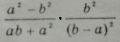 frac{ a^{2}- b^{2}  }{ab+ a^{2} } * frac{ b^{2} }{(b-a) ^{2} } =  frac{(a-b)(a+b)}{a(b+a)}* frac{ b^{2} }{(a-b)(a-b)} =  frac{ b^{2} }{a(a-b)}
