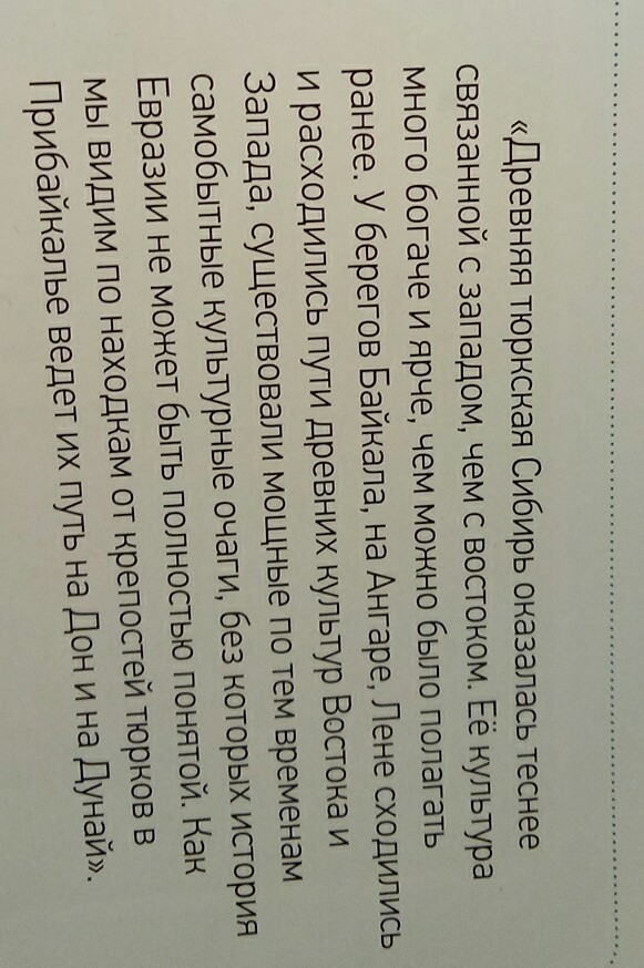 «Ежелгі Түркі Сібірі Шығыспен емес, Батыспен тығыз байланысты болды. Оның мәдениеті әлдеқайда бай әрі жарқын, бұрынғыдан гөрі, болжауға болатын. Байкал көлінің жағасында, Ангара, Лена, Шығыс пен Батыстың ежелгі мәдениеттерінің жолдары бір-біріне жақындап, жоғалып кетті, ал кезде Еуразия тарихы толықтай түсініксіз болатын. Байкалдағы түріктердің бекіністерінен көріп отырғанымыздай, олар Донға және Дунайға бара жатыр ».