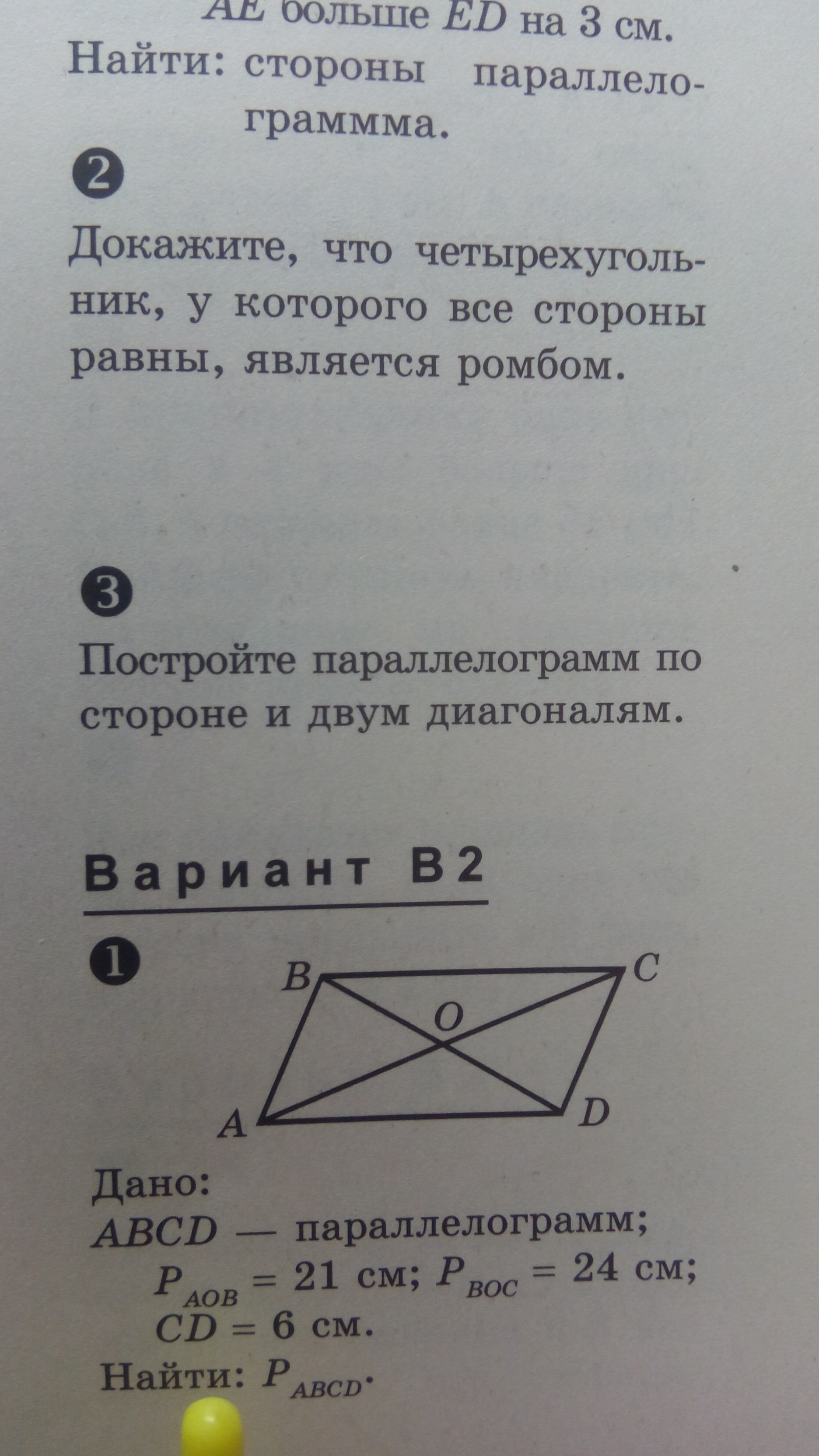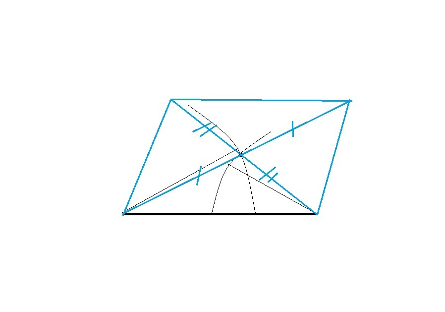 Строим основание, затем циркулем проводим дуги = половинам диагоналей. Точка их пересечения будет серединой диагоналей. Продлеваем их на полную длину - получаем искомый параллелограмм