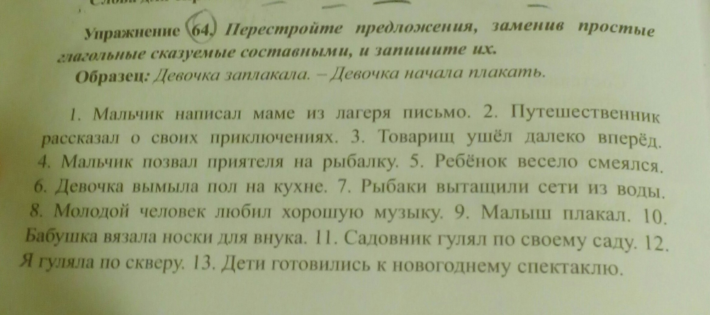 Мальчик СТАЛ ПИСАТЬ маме из лагеря письмо. Путешественник НАЧАЛ РАССКАЗЫВАТЬ о своих приключениях. Товарищ СТАЛ ИДТИ далеко вперёд. Мальчик НАЧАЛ ЗВАТЬ приятеля на рыбалку. Ребёнок НАЧАЛ весело СМЕЯТСЯ. Девочка СТАЛА МЫТЬ пол на кухне. Рыбаки СТАЛИ ВЫТАСКИВАТЬ сети из воды. Молодой человек СТАЛ ЛЮБИТЬ хорошую музыку. Малыш СТАЛ ПЛАКАТЬ. Бабушка НАЧАЛА БРАТЬ носки для внука. Садовник СТАЛ ГУЛЯТЬ по своему саду. Я НАЧАЛА ГУЛЯТЬ по скверу. Дети НАЧАЛИ ПОДГОТАВЛИВАТЬСЯ к новогоднему спектаклю. мда уж как сложно! я и то в 3 классе