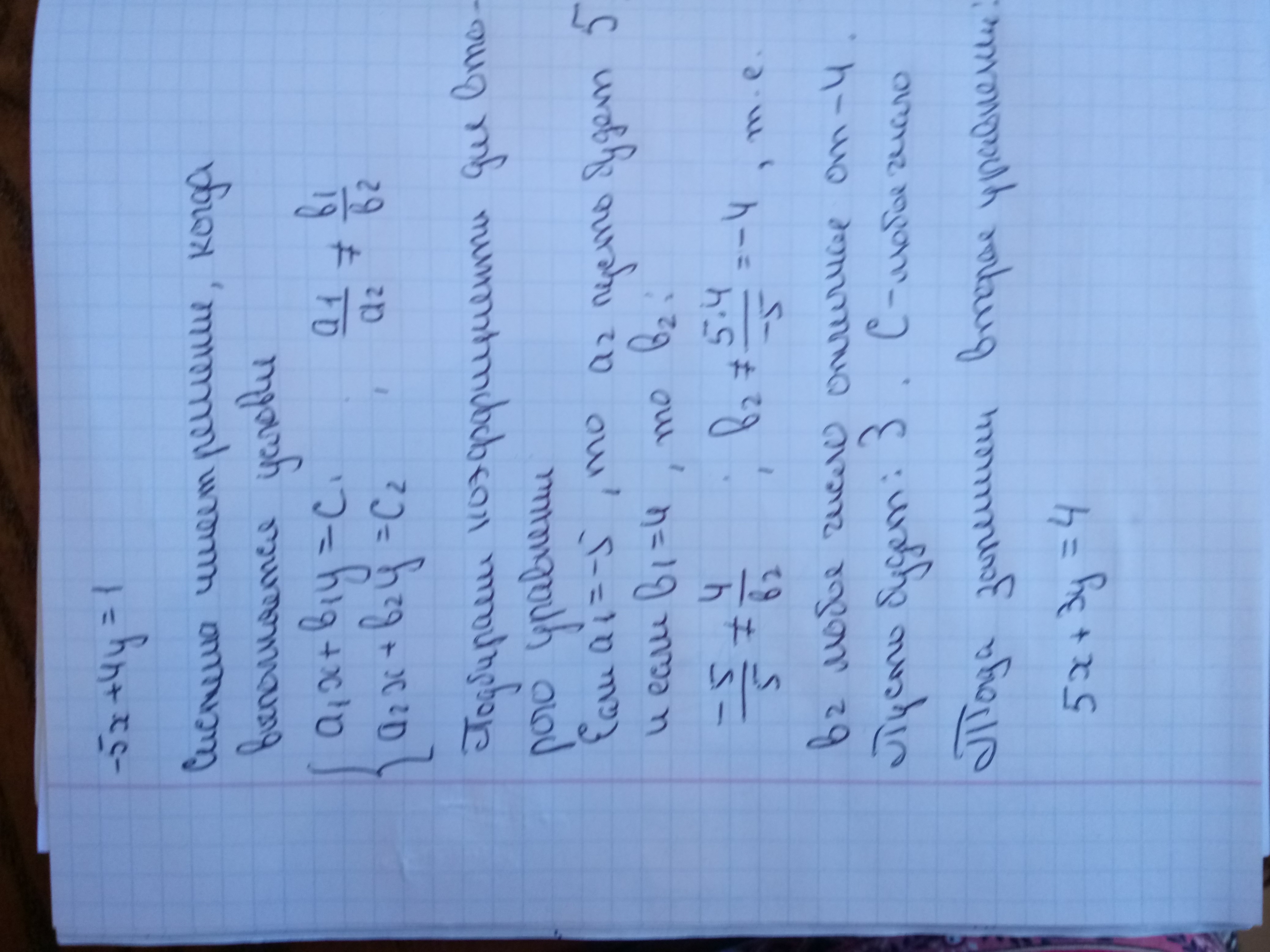 К каждому из следующих уравнений подберите второе уравнение так, чтобы полученная система имела единственное решение -5x+4y=1