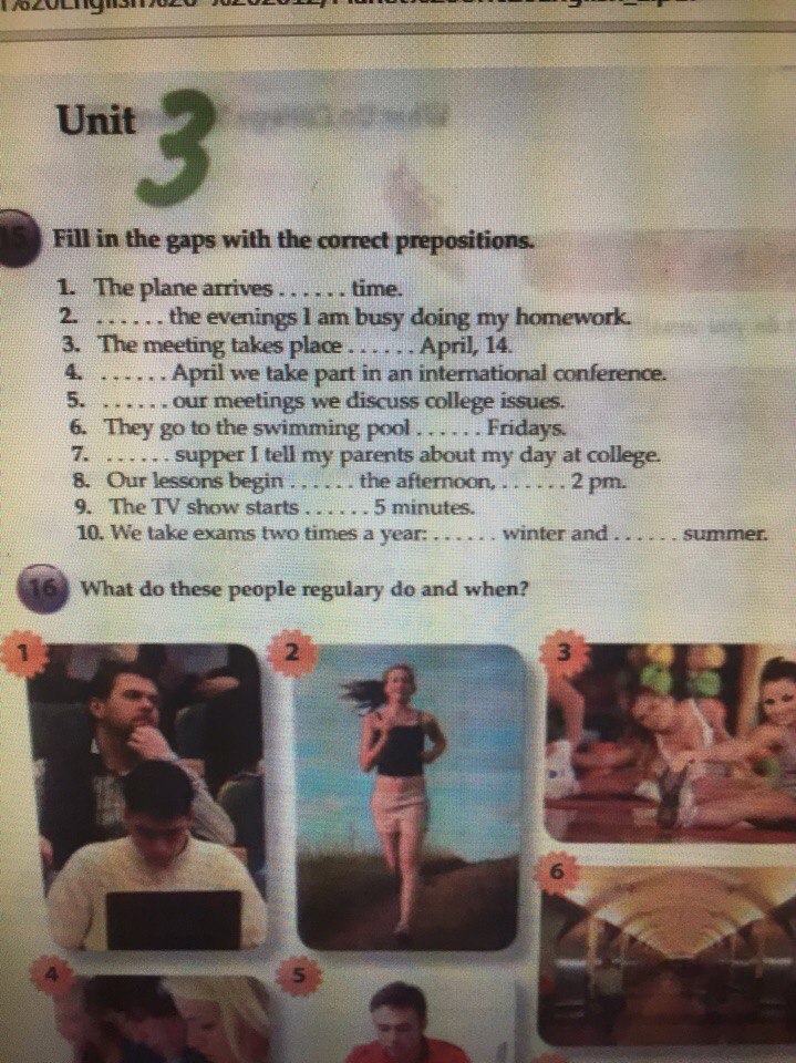 перевод :1)Самолет прилетел вовремя .2)По вечерам я занят выполнением моей домашней работы. 3)Встреча состоится 14 апреля . 4) В апреле мы принимаем участие в международной конференции . 5)На наших встречах мы обсуждаем вопросы колледжа .6) По пятницам они ходят в бассеин 7)За ужином я рассказываю родителям о том , как прошел мой день в колледже . 8) Наши уроки начинаются в 2 часа дня . 9) Шоу началось 5 минут назад . 10)Мы дважды сдаем экзамены : зимой и летом .