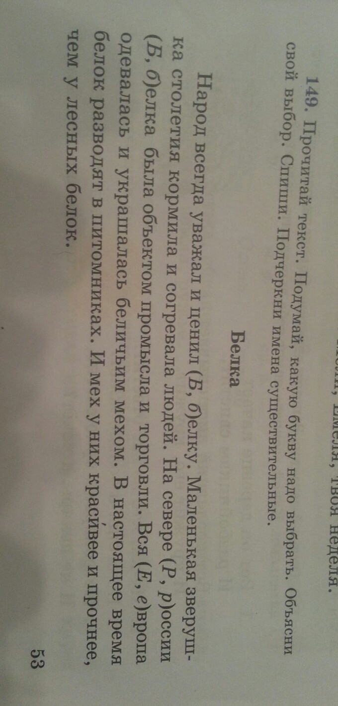 Прочитай текст. Подумай, какую букву надо выбрать. Объясни свой выбор. Спиши. Подчеркни имена существительные.