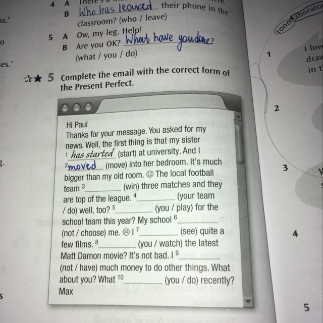 2 have moved 3 have won 4 Have your team done 5 Have you played 6 hasn’t chosen 7 have seen 8 Have you watched 9 haven’t had 10 have you done