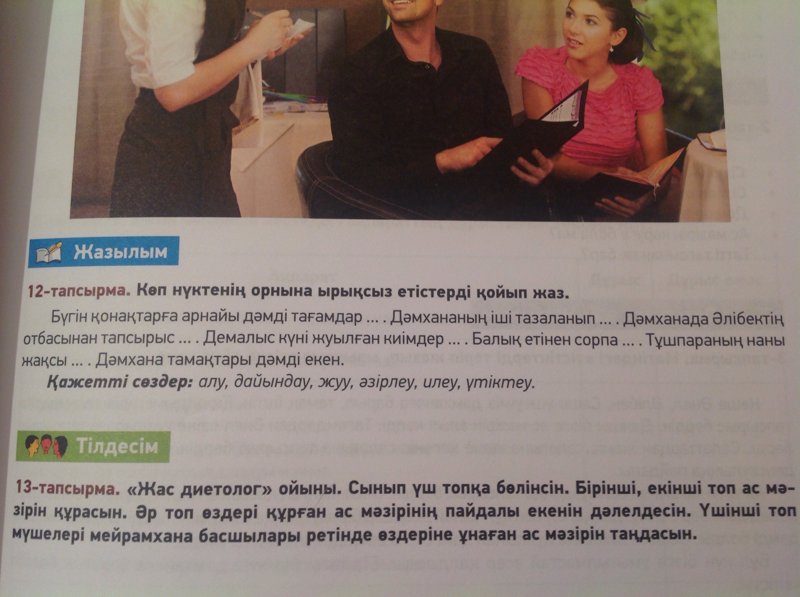 Бүгін қонақтарға арнайы дəмді тағамдар əзірленді. Дəмхананың іші тазаланып жуылды.Дəмханада Əлібектің отбасынан тапсырыс алынды.Демалыс күні жуылған киімдер үтіктелді .балық етінен сорпа дайындалды.тұшпараның наны жақсы иленді