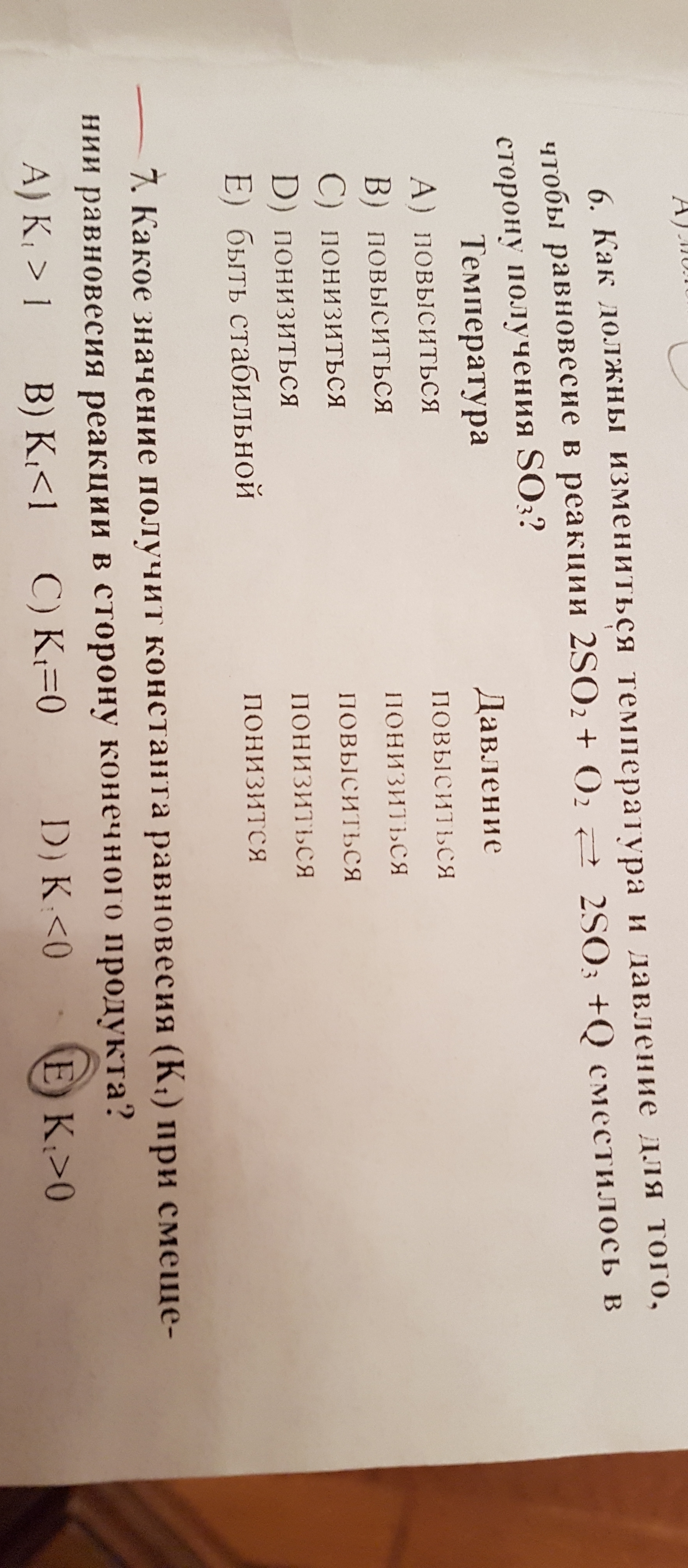Реакция экзотермическая,поэтому при понижении температуры равновесие будет смещаться в сторону продуктов реакции.С увеличением давления равновесие будет смещаться в сторону меньших объемов,значит в сторону оксида серы (VI).Следовательно,ответ С)температура должна понизиться,а давление повыситься