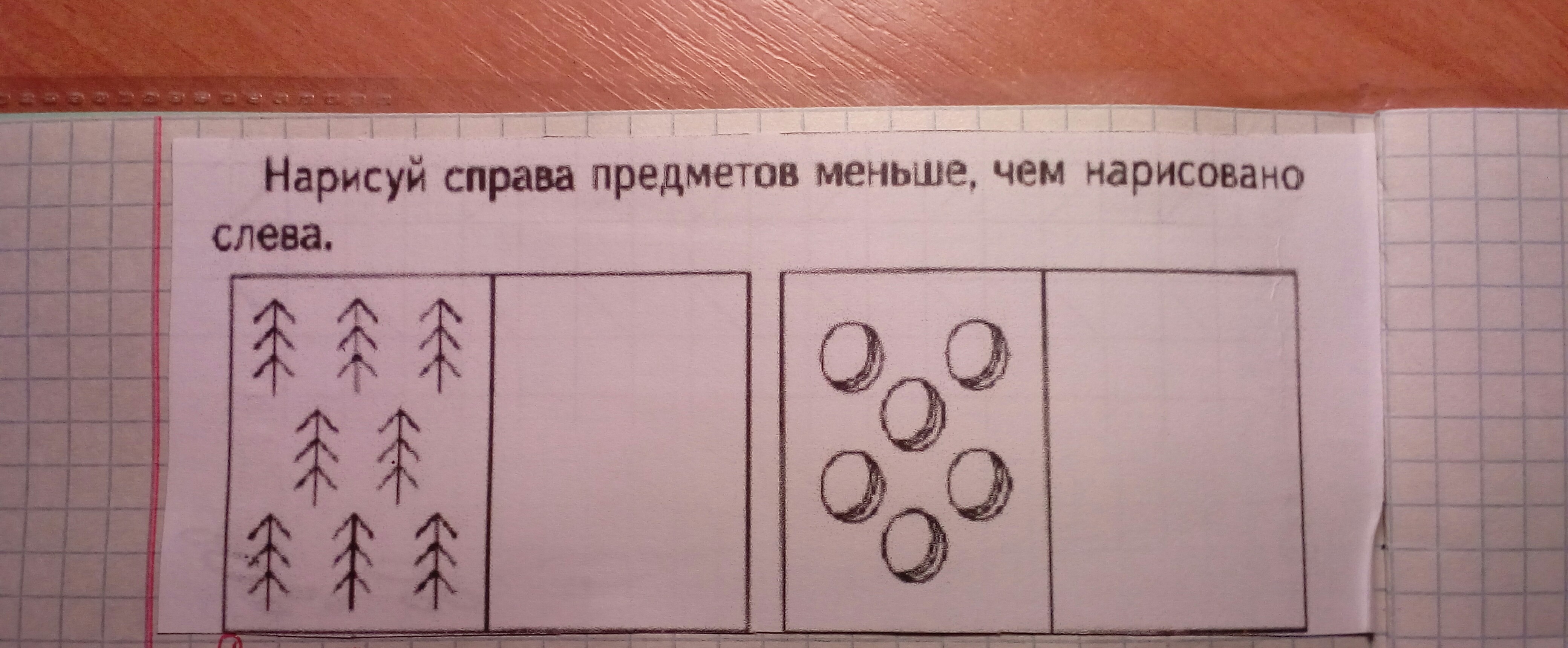 нужно нарисовать предметов МЕНЬШЕ, чем дано. в первой колонке 8 елочек, значит нужно все меньше числа 8, допустим 3. во второй колонке также.