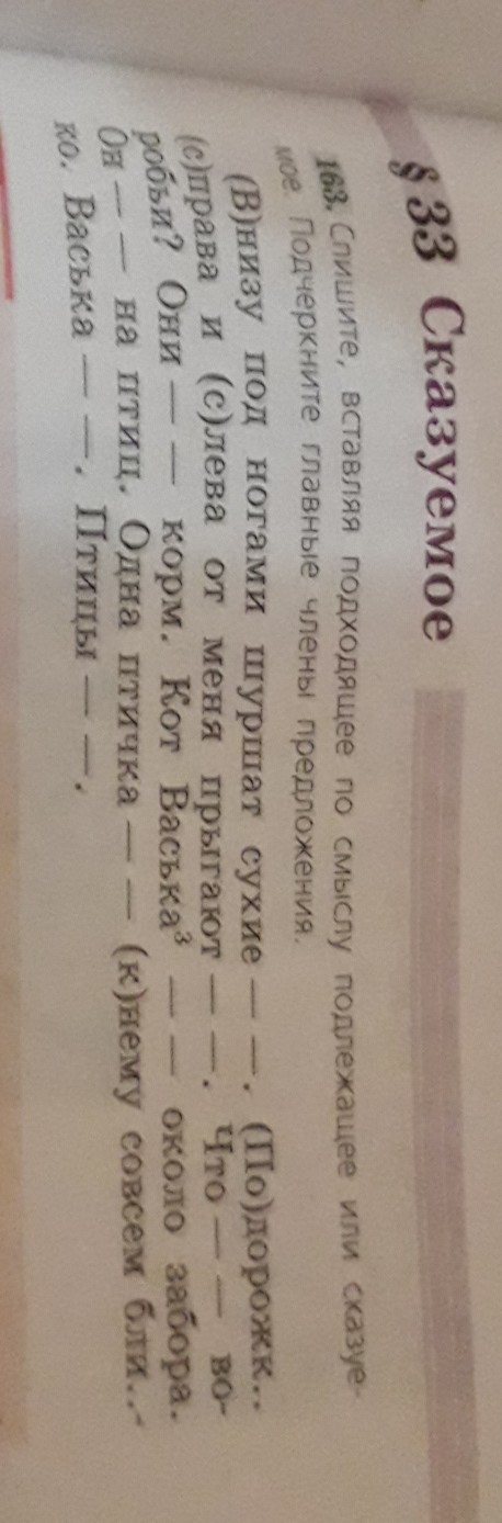 Внизу под ногами шуршат сухие листья. Шуршат листья - главные члены предложения.