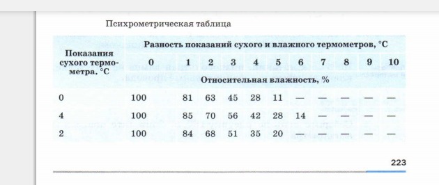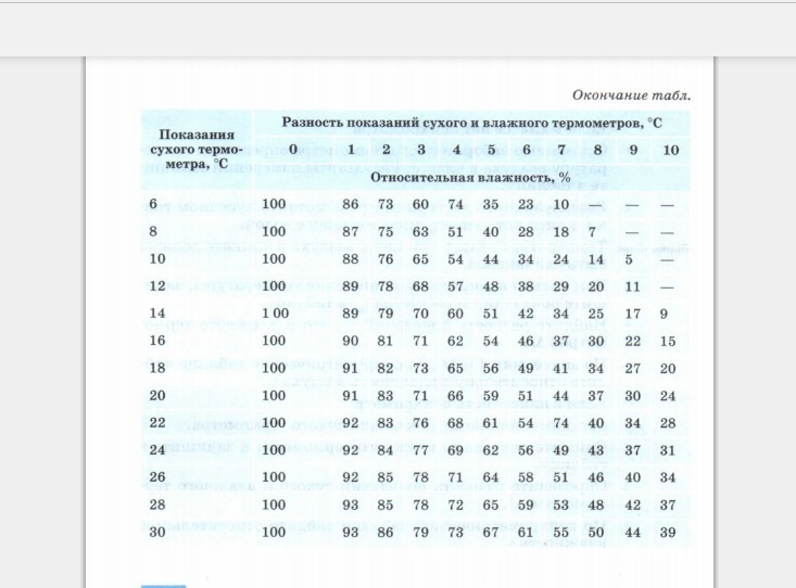 По психометрической таблице определяю влажность воздуха в классе. У меня получилось, что влажность воздуха равна