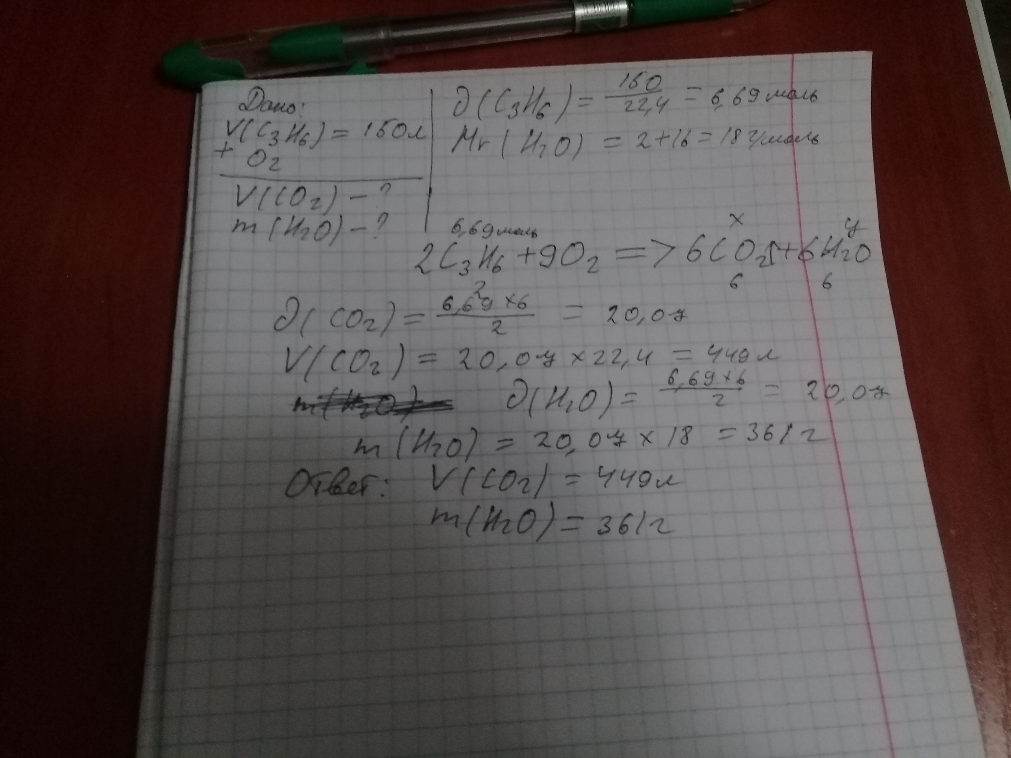 Сколько литров выделяется углекислого газа при горении пропена объемом 150 литров, сколько при этом выделяется грамм воды?