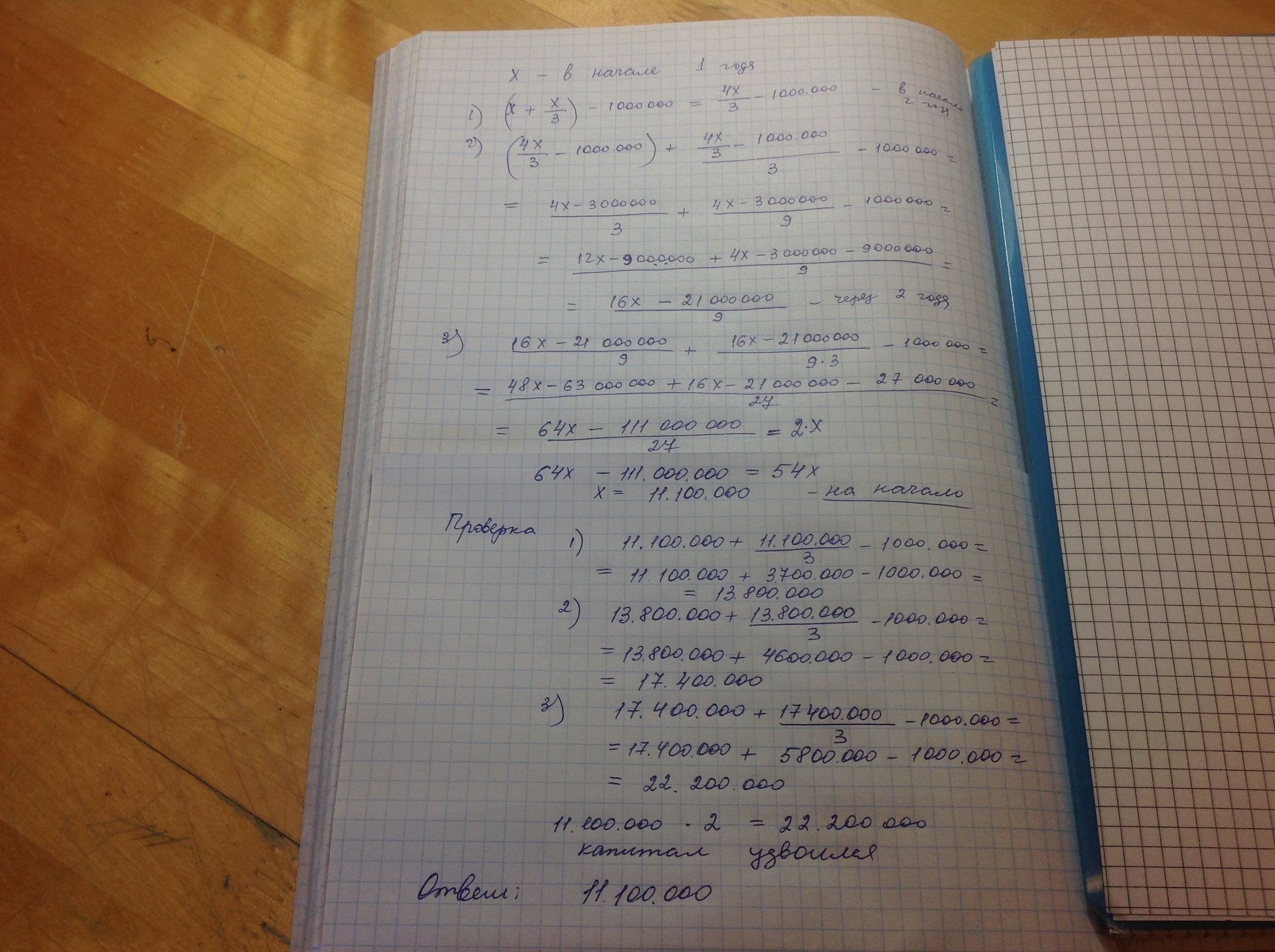 некотором банке капитал ежегодно увеличивается на треть суммы, которая была в банке в начале года, уменьшенной 1 млн зедов ( зед условная денежная единица).Через 3 года капитал банка удвоился. Сколько денег было в банке сначала