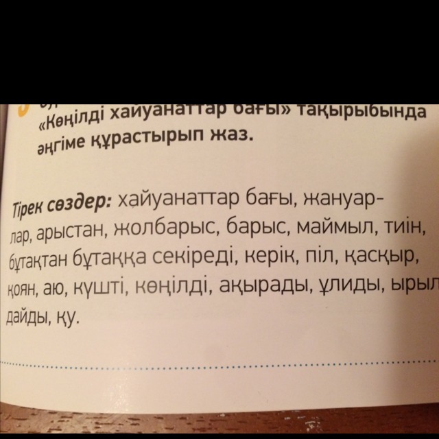 Мен ата-анаммен хайуанаттар бағына бардым.Мен жануарларға тəнті болдым.Ол жақта аң патшасы арыстан, айбатты жолбарыс,көңілді тиіндерді көрдім.Керік пен маймыл достасып алған.Қасқыр маған қарап ұлыды.Түлкі өте қу.Ал аю болса,пілмен бірге ойнап жур.Тиін бұтақтан бұтаққа секіріп,көтеріңкі көңілде жур.Ал арыстан болса өзінің күшін көрсетіп ақырады.Жолбарыс оған ырылдап жауап қайтарды.Бəрі кушті болды.Хайуанаттар бағынан өте көілді қайттым.