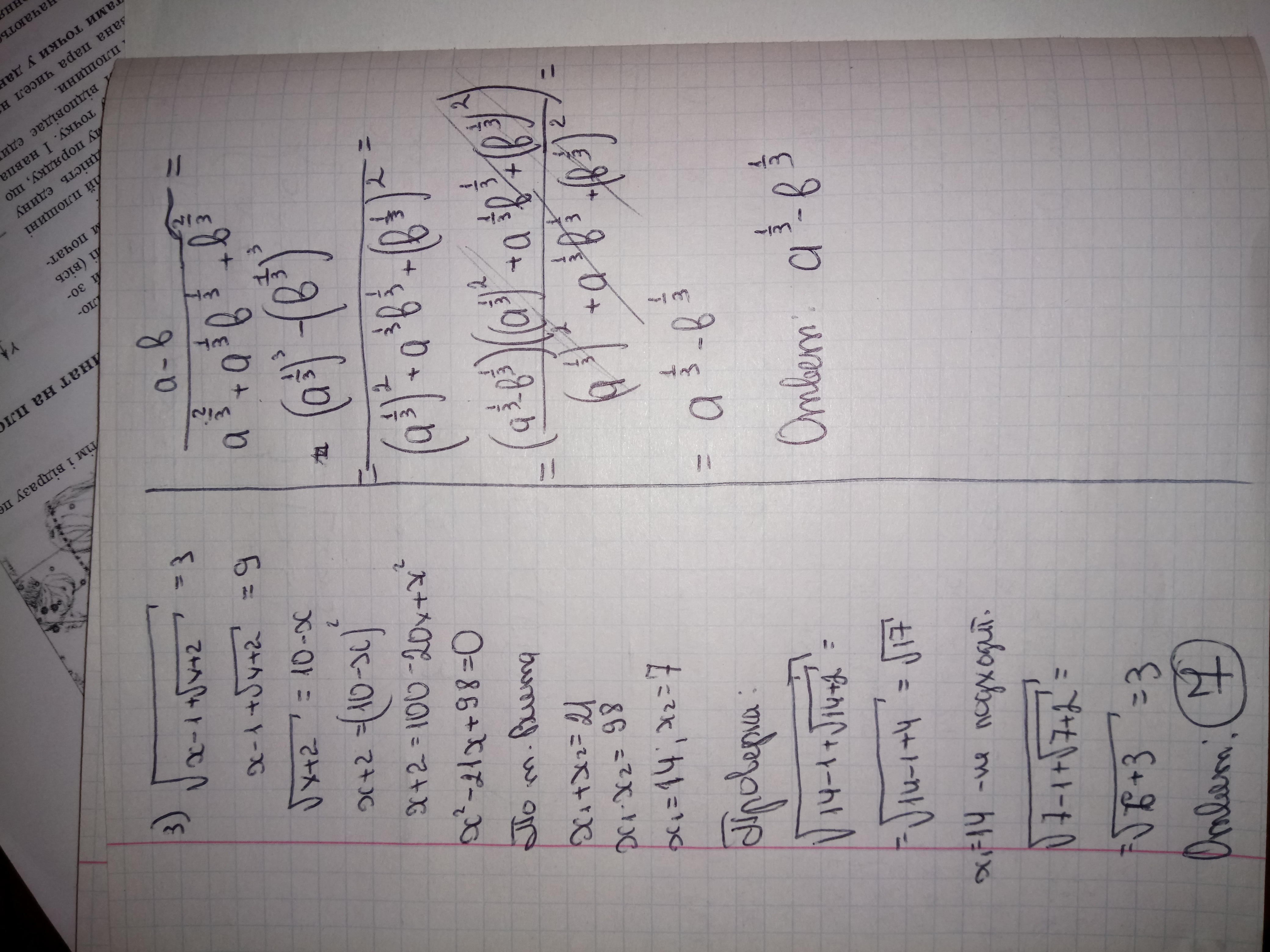 x=(21+7)/2=14 √(14-1+√(14+2))= √17≠3 не подходит