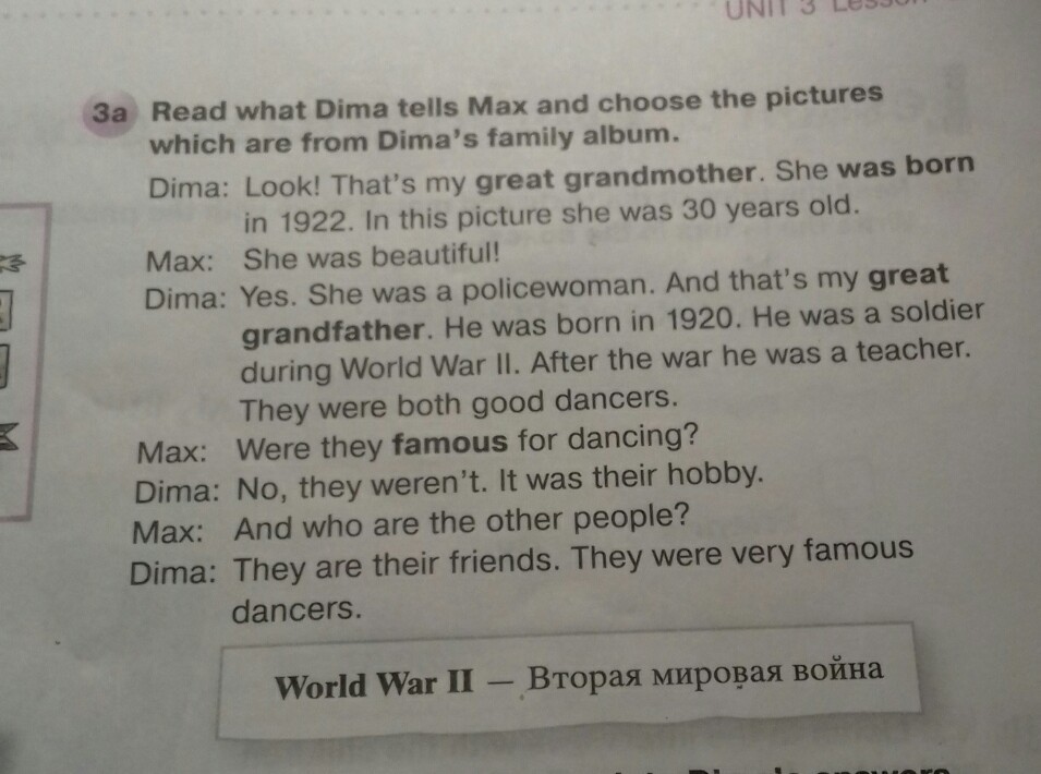 Дима: Да. Она была полицейским. А это мой прадедушка. Он родился в 1920. Он был солдатом во время второй мировой войны. После войны он был учителем. Они оба были хорошими танцорами
