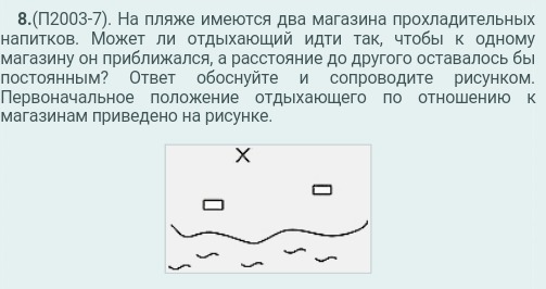Если расстояние до второго магазина остается постоянным, то отдыхающий может двигаться только по дуге окружности с центром в этом втором магазине. Таким образом отдыхающий движется по дуге окружности. Может ли он при этом приближаться к первому магазину? Думаю, что может. На рисунке непонятно, где первый магазин, а где второй.