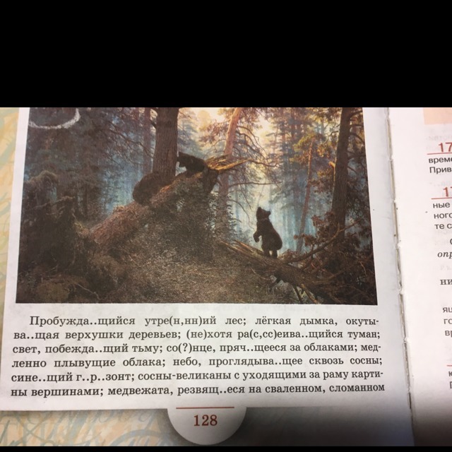 небо,проглядывающее сквозь сосны;синеющий горизонт; сосны-великаны с уходящими за раму картины вершинами;медвежата,резвящиеся на сваленном,сломанном................