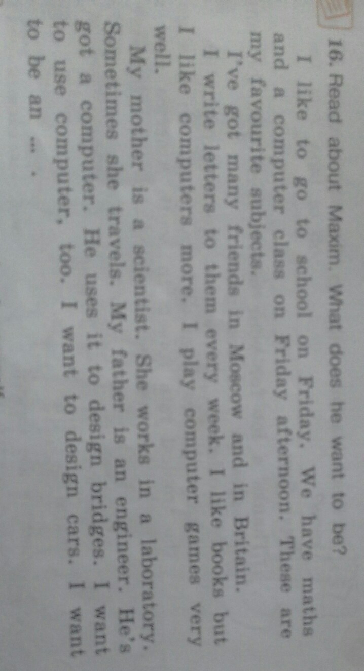 Она любит свою работу. Мой папа программист. Он имеет компьютер. Он работает без выходных. Он любит компьютеры тоже. Он ездиит на машине. Он бывает на... Перессказ:I like to go to school on Fridays. On this day we have math and we do computer classes on Fridays in the afternoon. These are my favorite subjects. I have many friends in Moscow and in Britain. I go to extra lessons every week. I love books, but I love computers more. I play computer games very much time. My mother is a scientist. She works in the lab.She loves her job. My father is a programmer. He has a computer. He works without days off. He likes computers, too. He drives a car. It happens on ...