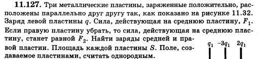 три металлические пластины,заряженные положительно ,расположены параллельно друг другу так, как показано на рисунке 11.32. Заряд левой пластины q. Сила ,действующая на среднюю пластину F1. Если правую пластину убрать, то сила, действующая на среднюю пластину, станет равной F2. Найти заряды средней и правой пластин. Площадь каждой пластины S. Поле ,создаваемое пластинами,считать однородными. (СМОТРИТЕ ПРИКРЕПЛЕННЫЕ ФОТО)