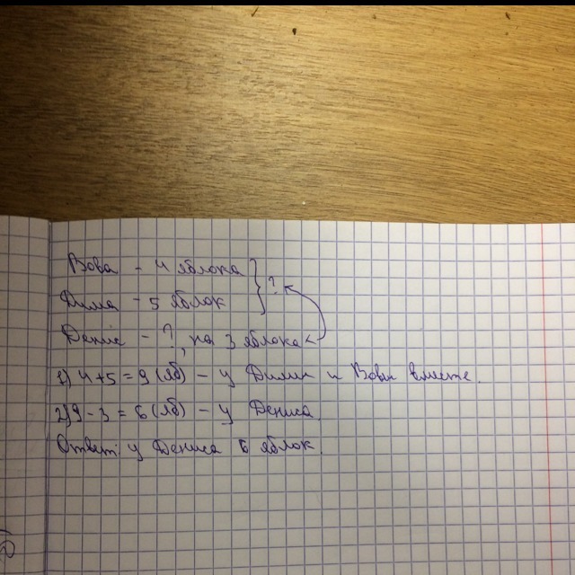 Составить условие к задаче и решить его.у вовы 4 яблока у димы -5 яблок. сколько яблок у дениса если известно что у него на 3 яблока меньше чем у вовы и димы вместе