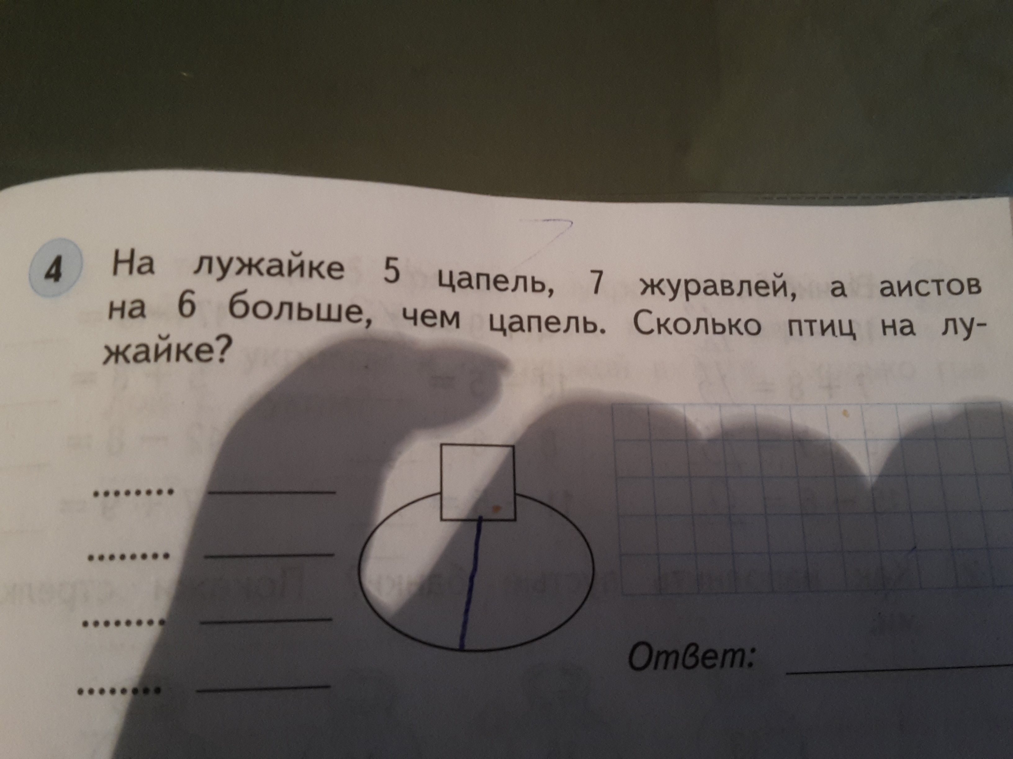 Решить задачу. На лужайке 5 цапель, 7журавлей, а аистов на 6 больше, чем цапель. Сколько птиц на лужайке?