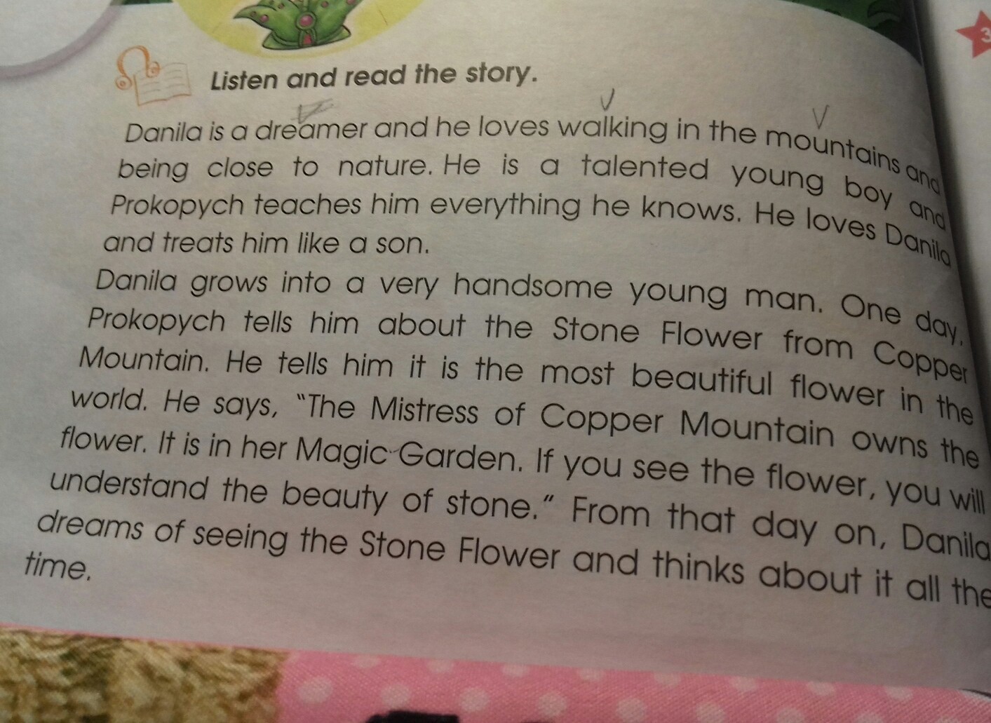 данила мечтатель. он любит прогулки в горах и быть близко к природе.он талантливый молодой мальчик и Прокопыч учит его всему что знает. данила превращается (вырастает) в прекрасного молодого мужчину (парня). однажды Прокопыч рассказывает ему о каменном цветке из горы Коппер.он говорит ему это самый красивый цветок в мире.он говорит " хозяйка горы коппер владеет цветком. он в ее волшебном саду.если ты увидишь цветок, ты поймешь красоту камня." с этого дня данила мечтал увидеть каменный цветок и думал о нем все время.