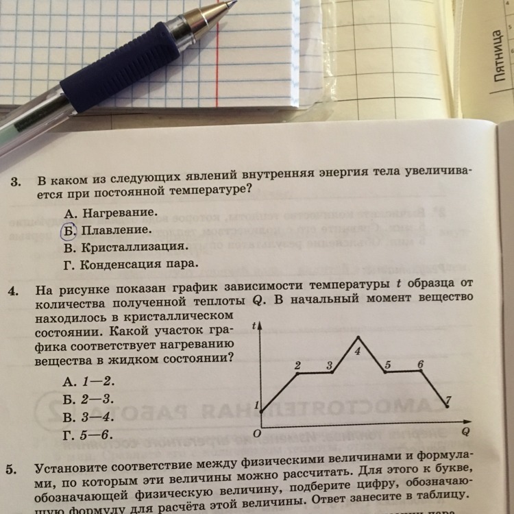 4. На рисунке показан график зависимости температуры образца от количества полученной теплоты. В начальный момент вещество находилось в кристаллическом состоянии. Какой участок графики соответсвует нагреванию вещества в жидком состоянии?