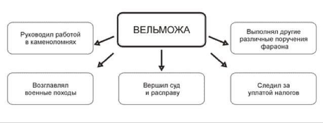 Вельможи собирали налоги, вели дела государства, выполняли поручения фараонов, вершили суд и расправу, разбирая дело о заговоре и тайнах во дворце, распоряжались работами на каменоломнях и т.д.