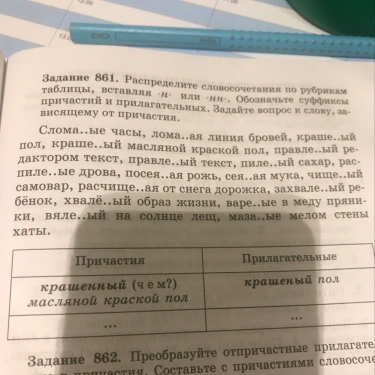 Сломаные часы, ломаная линия бровей, крашеный пол, крашенный масляной краской пол, правленный редактором текст, пиленный сахар, распиленные дрова, посеяная рожь, сеяная мука, чищенный самовар, расчищенная от снега дорожка, захваленный ребенок, хваленный образ жизни, вареные в меду пряники, валенный на солнце лещ, мазанные мелом стены