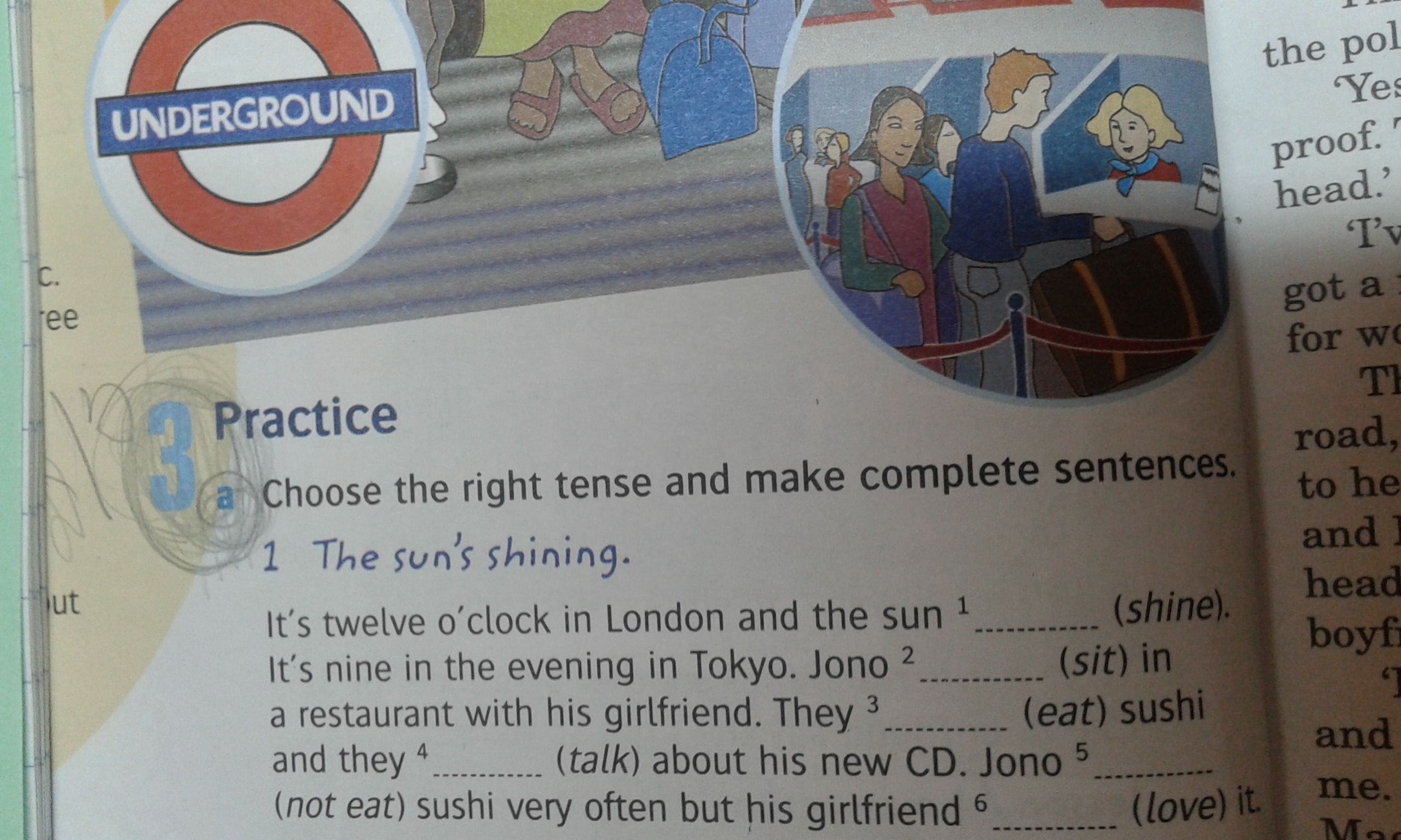 It’s twelve o’clock in London and the sun is shining.It’s nine in the evening in Tokyo.Jono sits in a restaurant with his girlfriend.They are eating sushi and they are talking about his new CD.Jono doesn’t eat sushi very often but his girlfriend loves it.