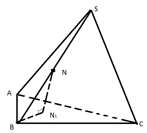 Так как NN1 - перпендикуляр к основанию пирамиды SABC, то есть ко всей плоскости основания ABC, то также эта прямая перпендикулярна N1B. Значит этот угол будет прямым.