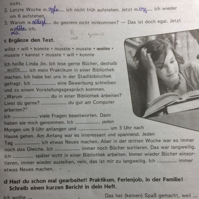 muss, willst, kannst, muss, musste, kann, musste, musste, wollte, will.