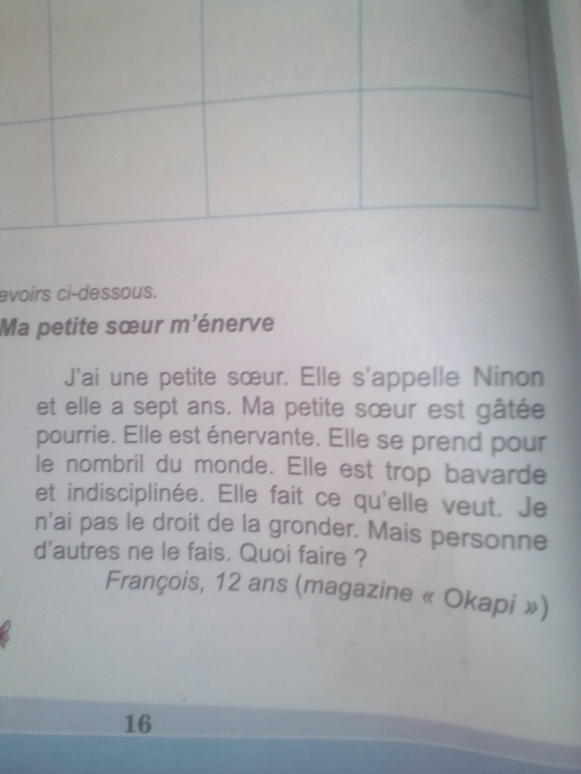 У меня есть маленькая сестра. Её зовут Нинон, ей 6 лет. Моя маленькая сестра ...(что-то там, перевести дальше не смогла)