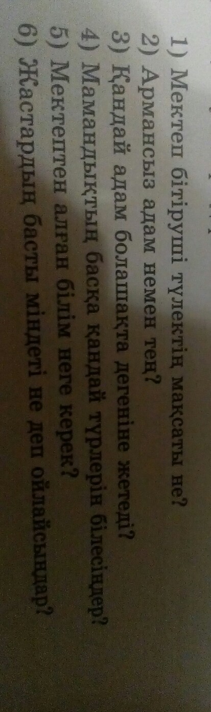 1.Оқуға тұсу.2.Жоқ адаммен тең.3.Мықты өз өзіне сенимди4.Мұнайшы психиолог полиция заңгер т.б.5.Оқуға түсу үшін.7.Отанын патриоты болу