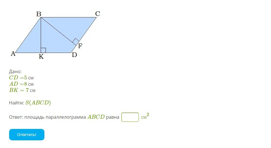 S параллелограмма равна ah(сторона на высоту к этой стороне)