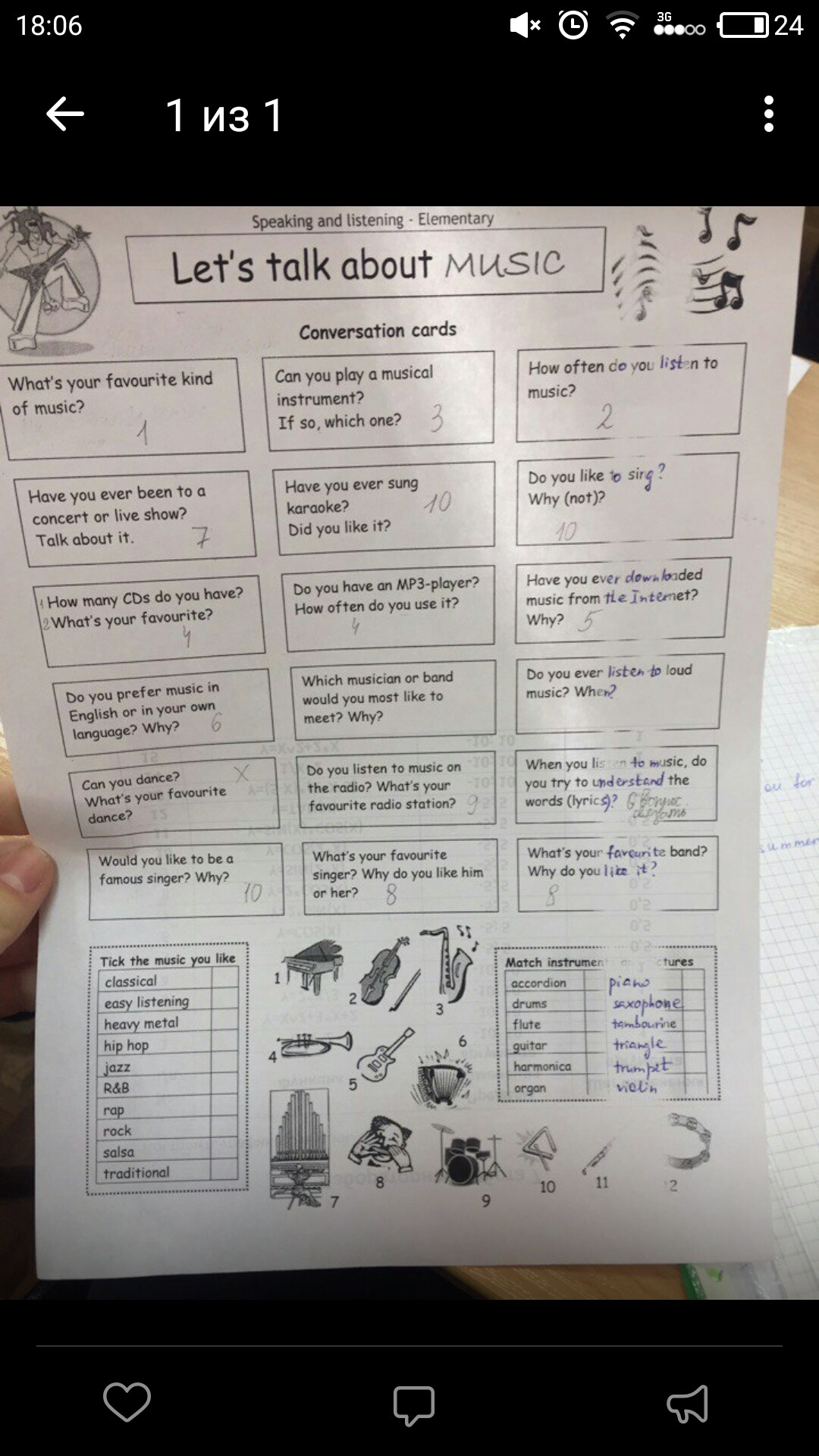 1)My favourite kind of music is pop. 2)(Если умеешь на каком либо инструменте исполнять напиши I can play . А если нет напиши But I can't play any instrument ) 3)I have one CD. 4) I'm listening to music every day 5) I've downalded music from internet many times. It's so funny listening to music. 6) I like music in English. When I listening to music i try to understand words. 7) - 8)My favourite singer is (напишешь любимую певицу или певца). I like her/him because she/he has a powerful voice. 9) I don't prefer listening to music on radio 10) I like sing karaoke