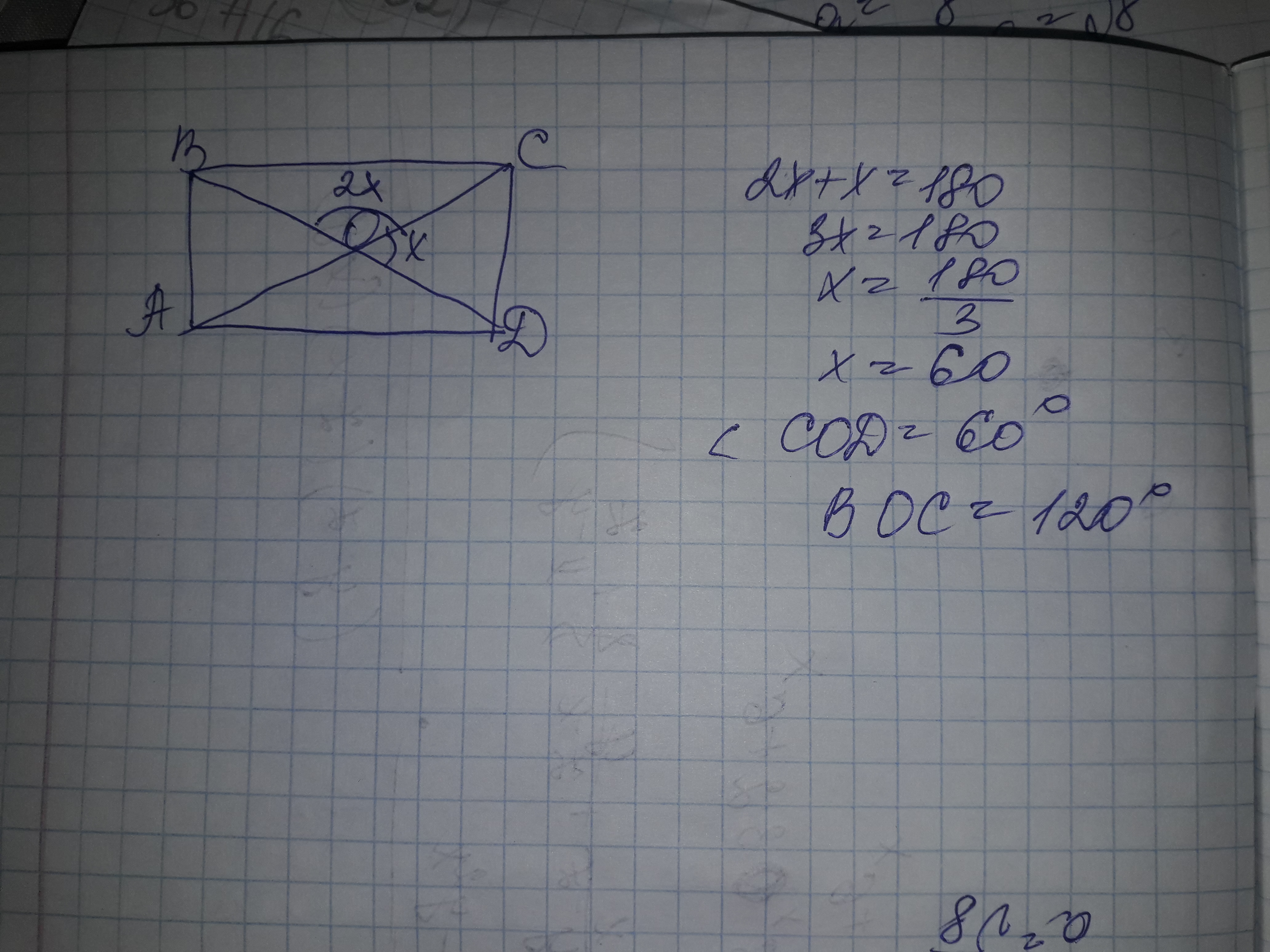 Диагонали прямоугольника АВСД пересекаются в точке О, угол ДОС в два раза больше угла СОВ. Найдите эти углы.