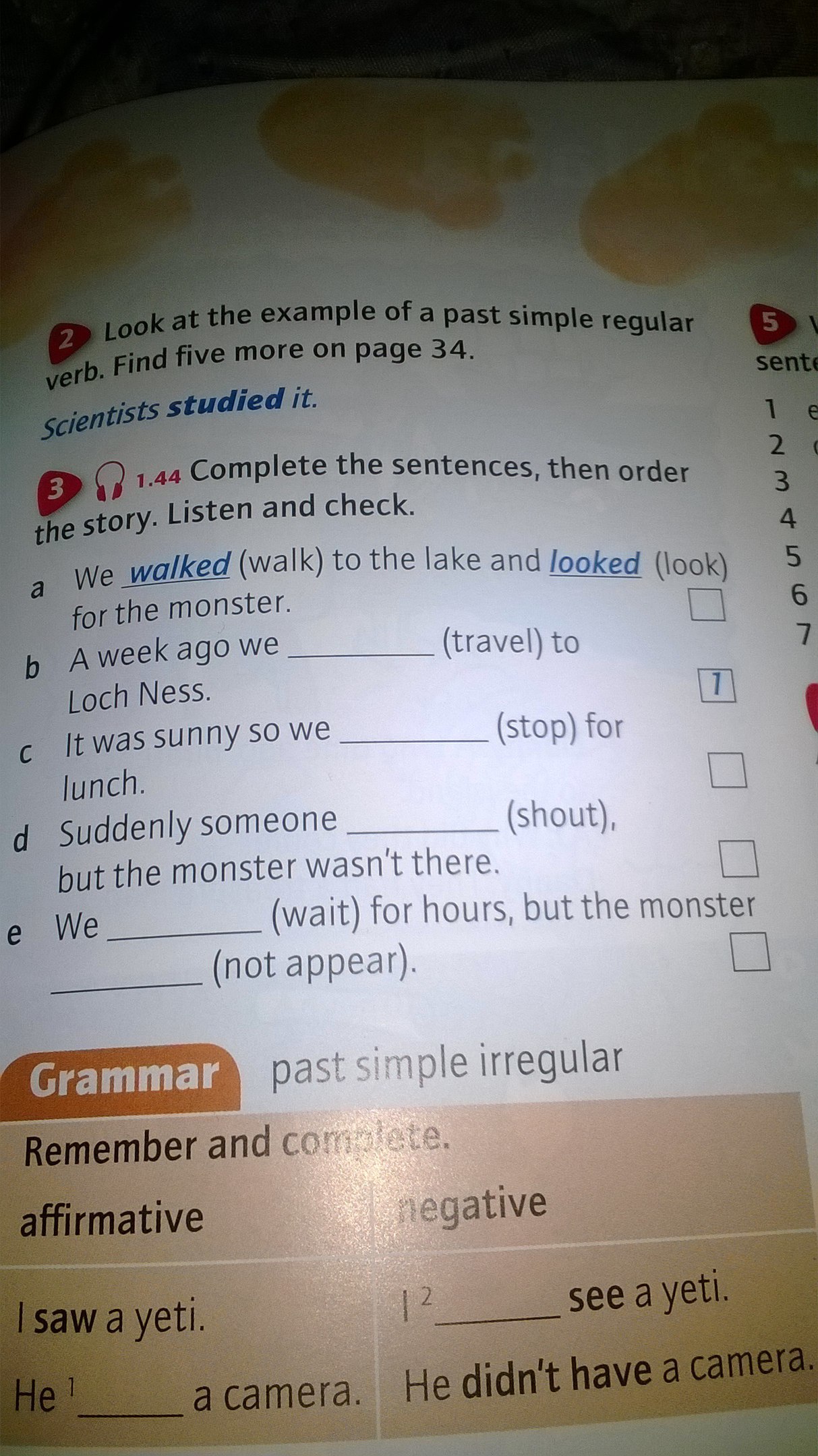 1)A week ago we traveled to Loch Ness 2)It was sunny so we stoped for lunch 3)suddenly someone shouted.but the monster wasn't here 4)we waited for hours.but the monster didn't appear.