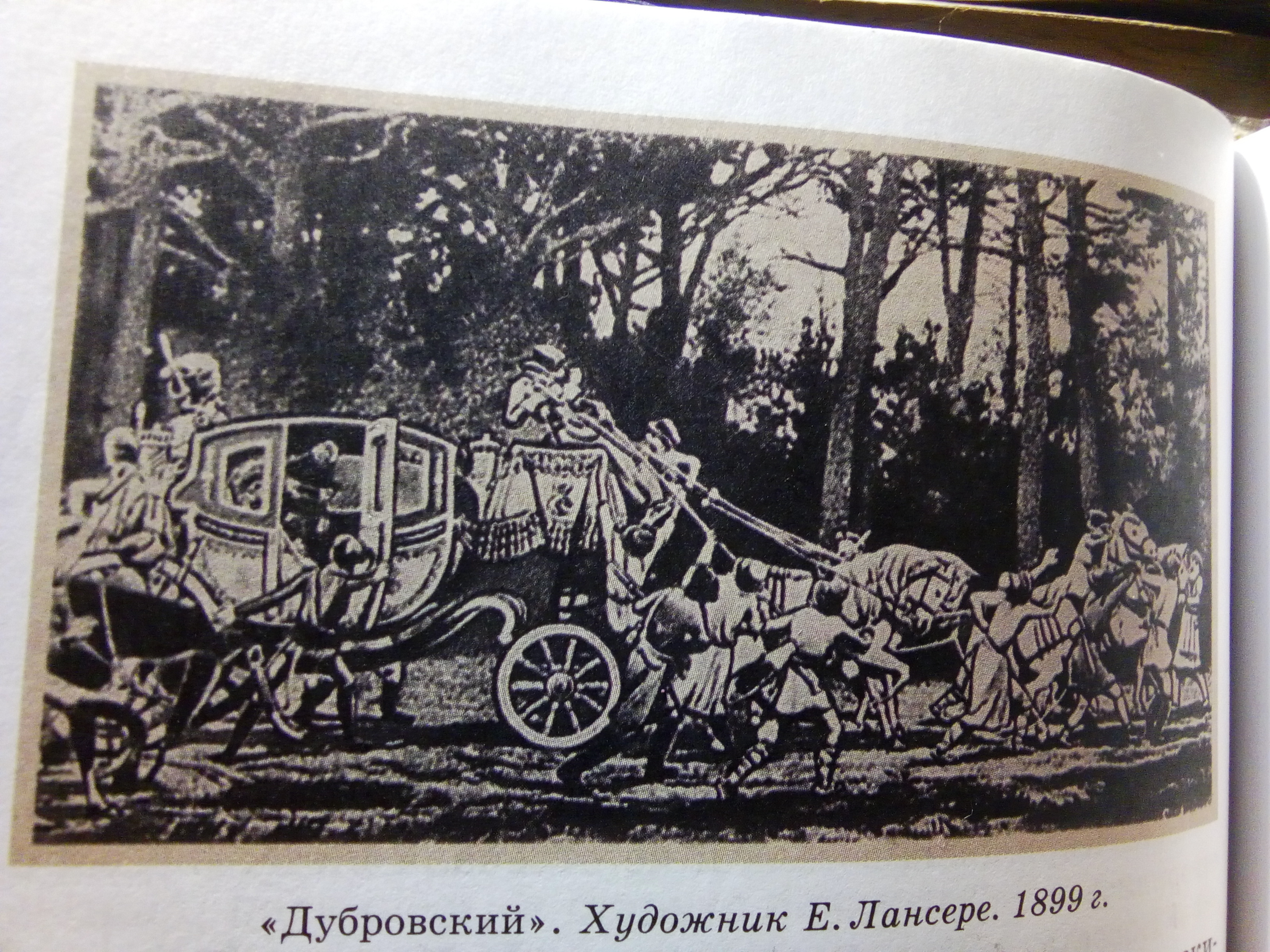 На картине изображен момент, когда люди Дубровского останавливают экипаж князя и княгини Верейских, едущих в Арбатово после венчания в церкви.