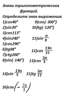 Синус положителен в 1 и 2 четвертях, косинус - в 1 и 4, тангенс и котангенс - в 1 и 3.