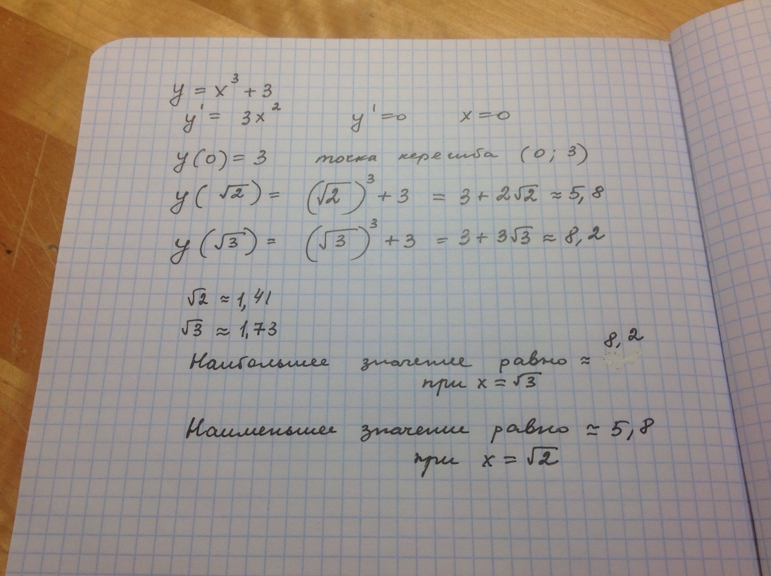 Найдите наибольшее и наименьшее значения функции y=x^3+3 на отрезке[ 2 под корнем; 3 под корнем ]
