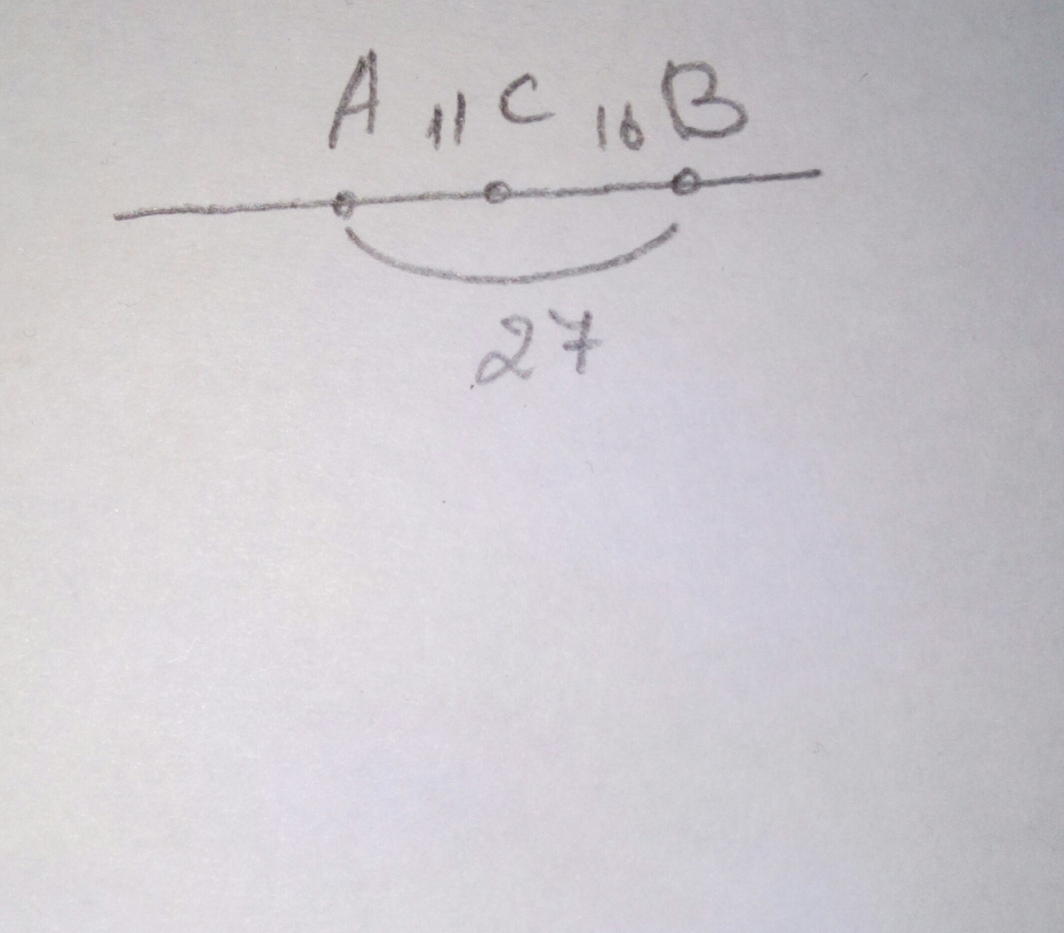На прямой отмечены точки А, В,С так,что АВ=27м АС= 11м ВС=16м.Какая из этих точек лежит между двумя другими?